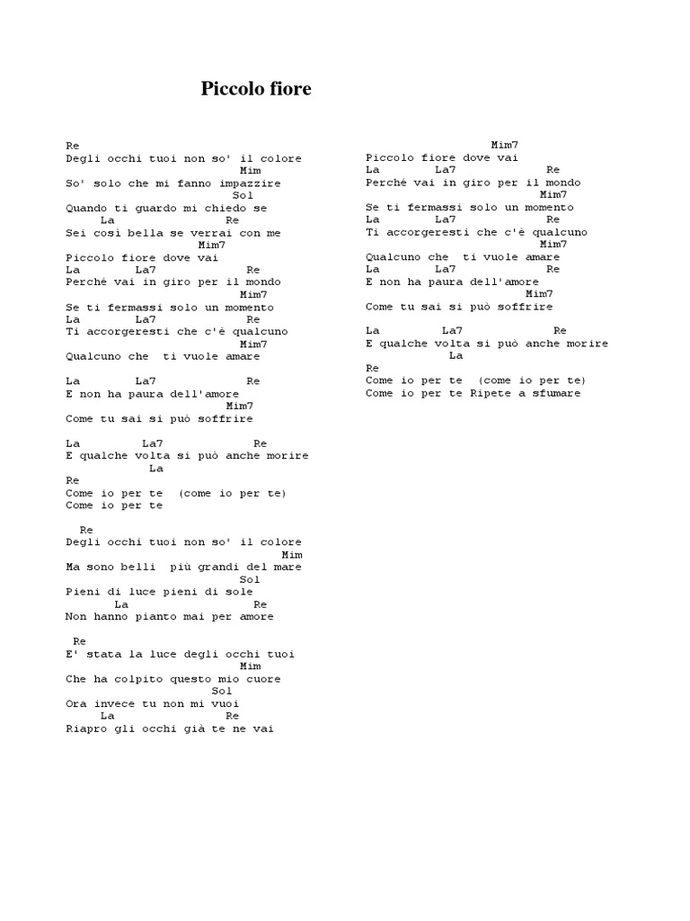 Perch vai in giro per il mondo E non ha paura dellamore. Come io per te come io per te. Piccolo fiore in PDF Trascrizioni parti musicali dalle canzoni basta inviare titolo della canzone nome cantante nome dello strumento Per favore inserisci di seguito i dati di contatto e un breve messaggio e.